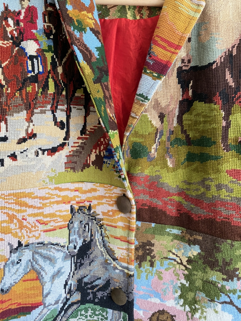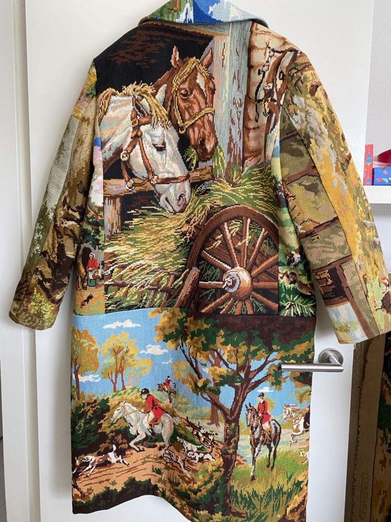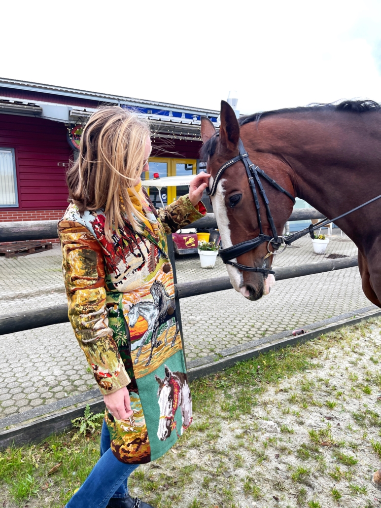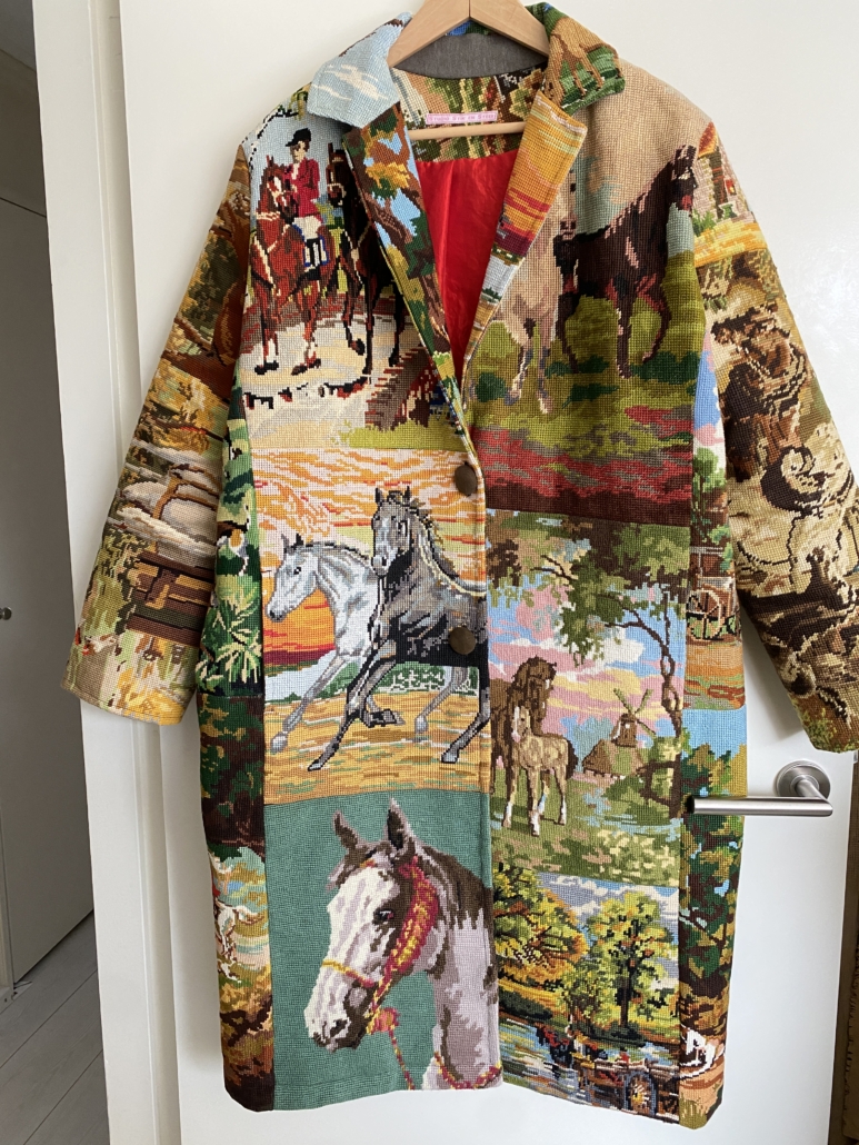 Deze geweldige jas is gemaakt van vintage borduurwerken met daarop de afbeeldingen van paarden, een uniek exemplaar! Er is er maar 1 van. Hou je van paarden, dan is dit dé jas voor jou!