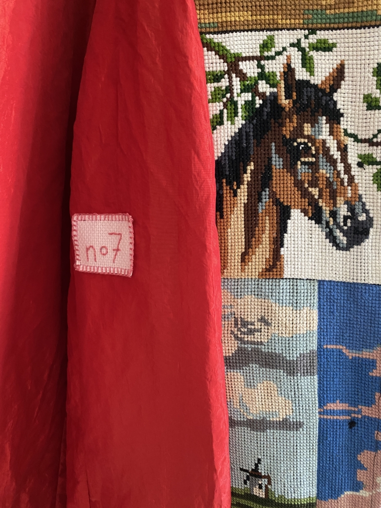 Normaal maak ik deze jassen alleen in opdracht maar omdat ik zoveel borduurwerken met paarden had wilde ik wat uitproberen. Daarom is dit jas nummer 7 geworden en dat is te zien aan de geborduurde nummering in de jas.